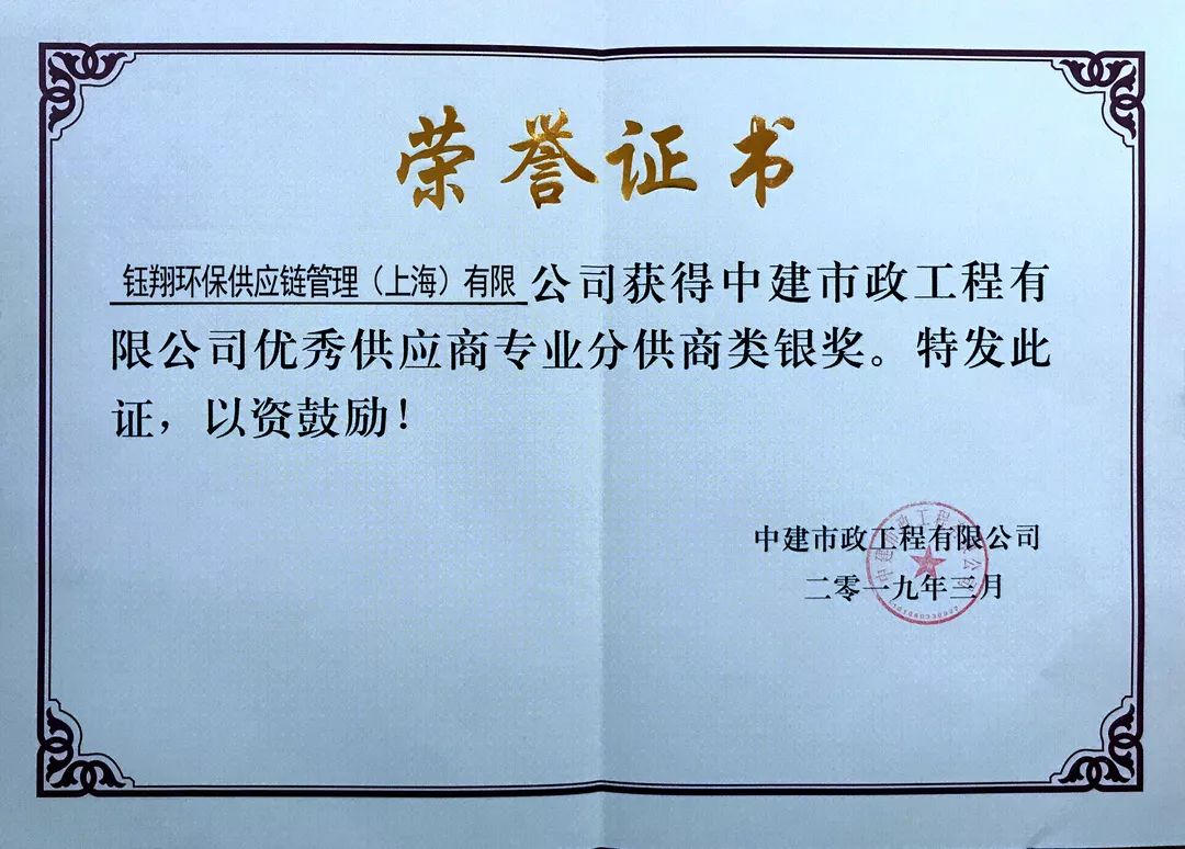 鈺翔環保供應鏈管理(上海)有限公司被中建市政工程有限公司評為優秀供應商