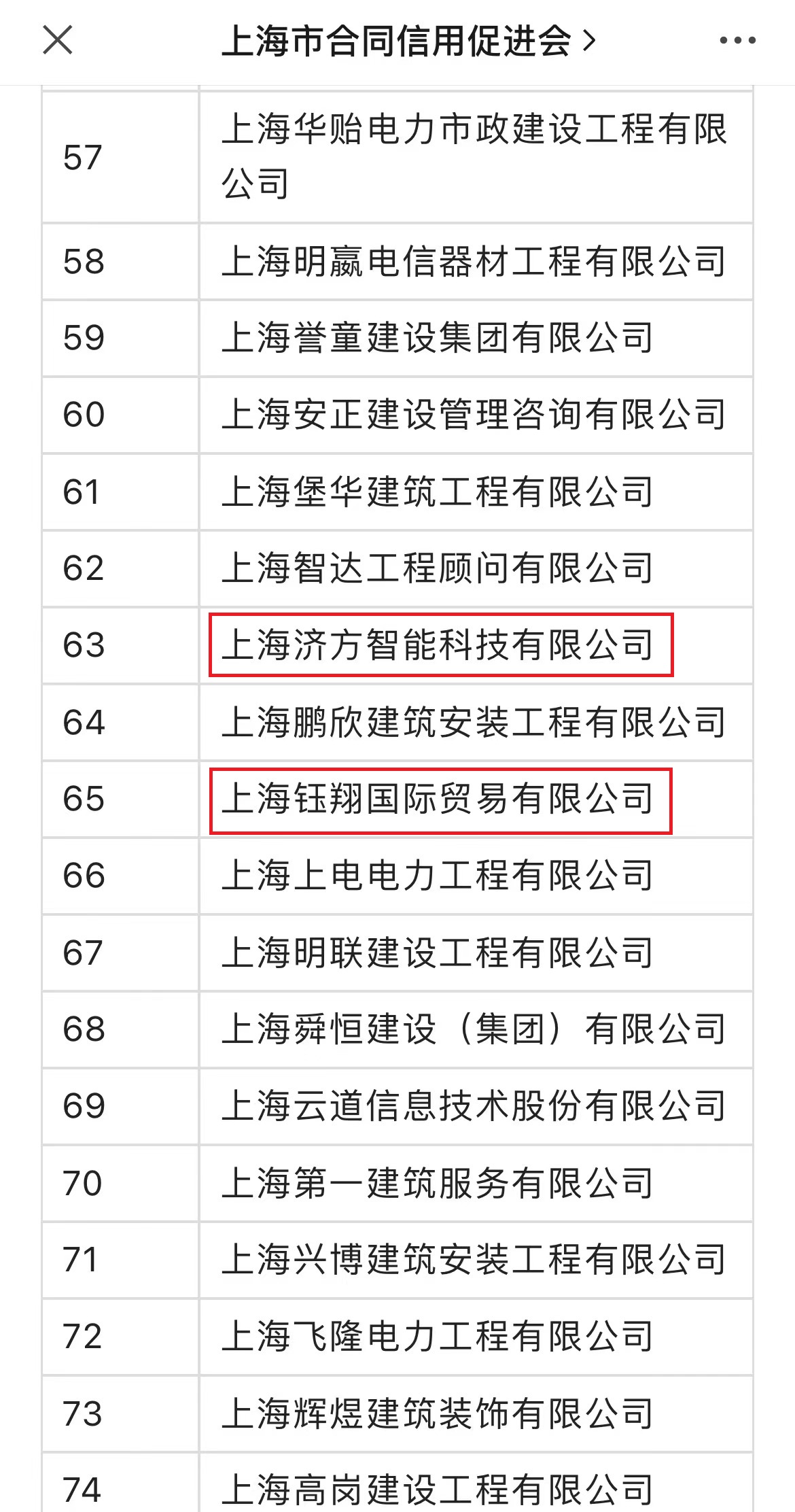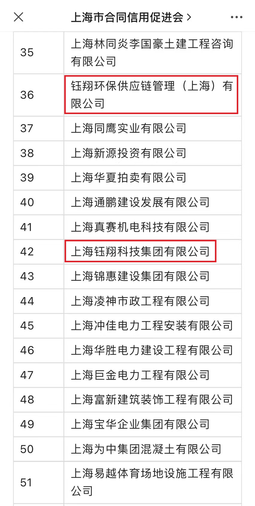 憑借完善的誠信建設體系與企業科學管理,上海鈺翔科技集團有限公司及其下屬的鈺翔環保供應鏈管理(上海)有限公司、上海濟方智能科技有限公司、上海鈺翔國際貿易有限公司再次榮獲“上海市守合同重信用企業”榮譽稱號。