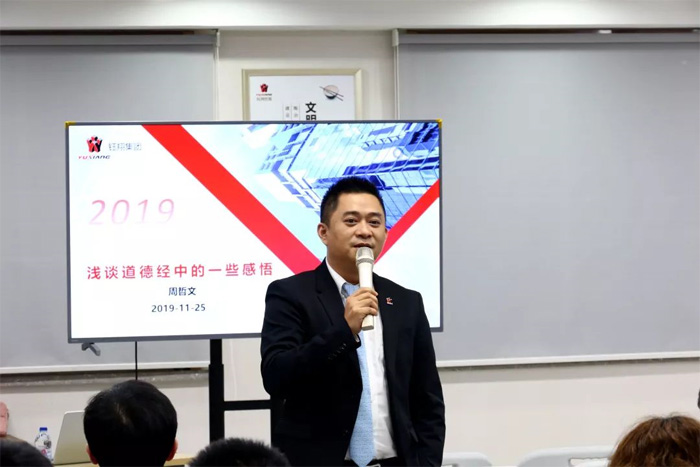 久源經貿總經理周哲文介紹了道德經的產生始末和自己在閱讀后的職場感悟。他從學習忠、信、仁的思想和管理之術兩方面解答了學習道德經的重要意義,并通過介紹職場小故事闡述了道德經中關于職場和管理方面的重要觀點,并要求大家勤奮學習,用知識指導工作,維護集團核心價值觀。